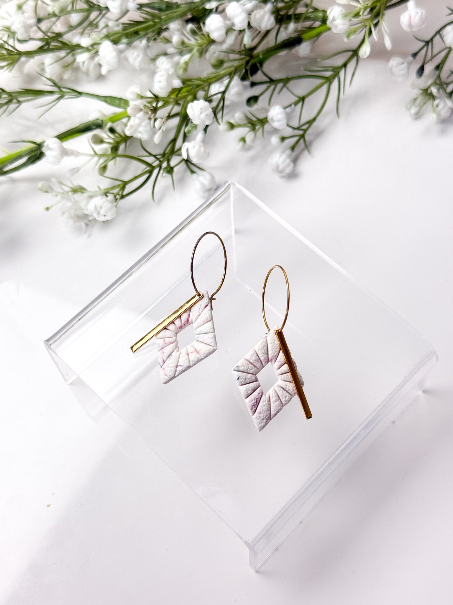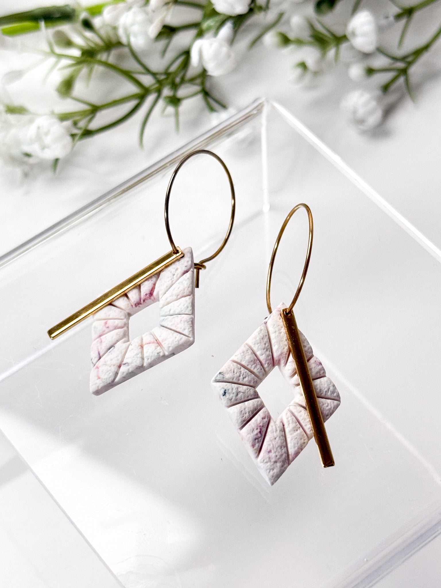 Each earring is made with surgical-grade stainless steel hooks, ball studs, or hoops, either gold or silver plated making them safe and comfortable for even the most sensitive ears. The earrings feature a unique and stylish design, handcrafted from durable polymer clay. With their lightweight feel and intricate patterns, these earrings are sure to make a statement wherever you go.