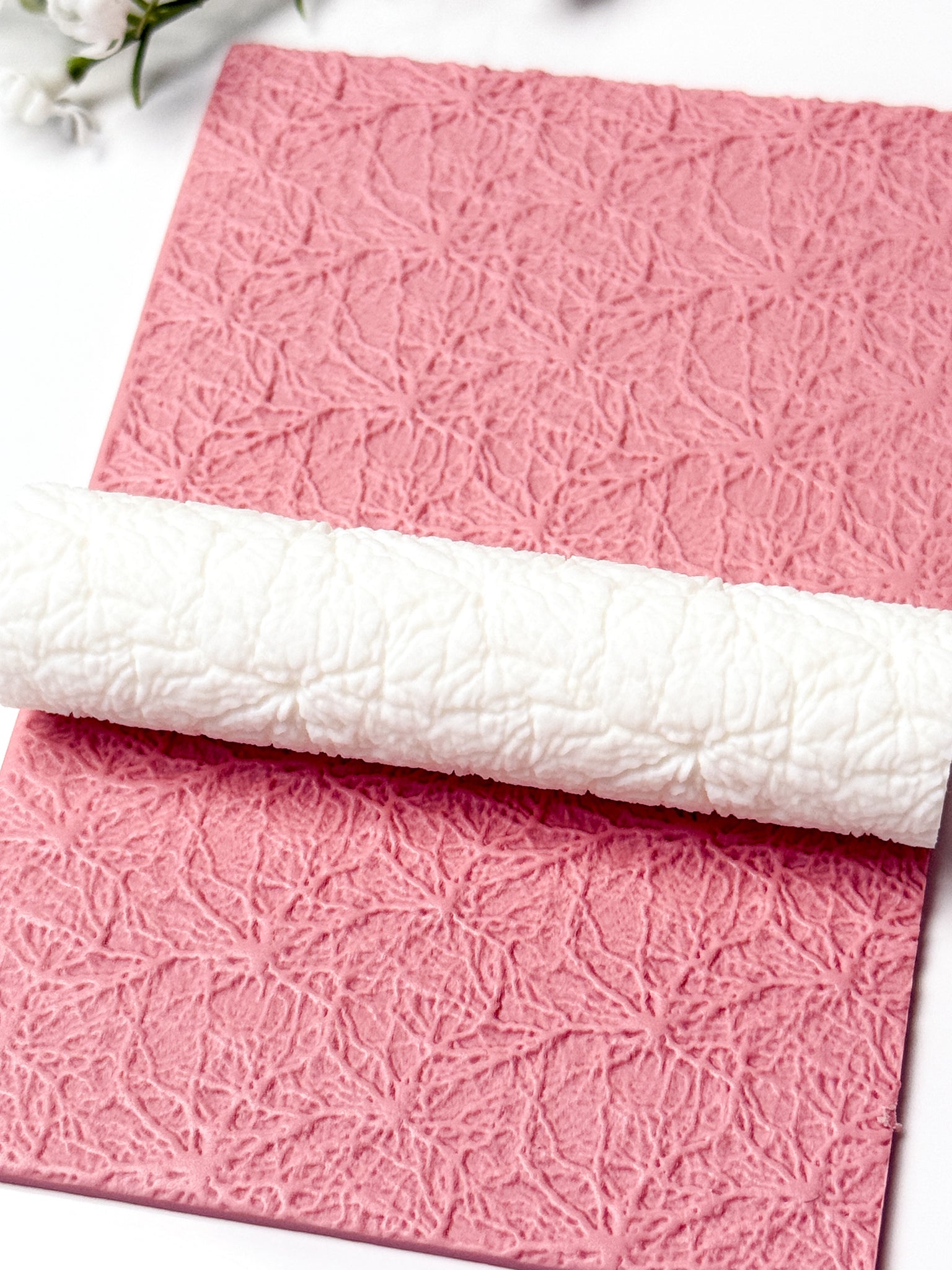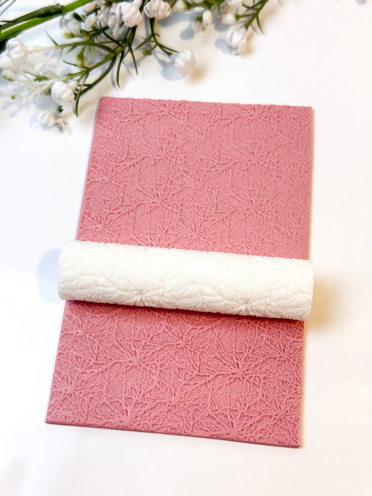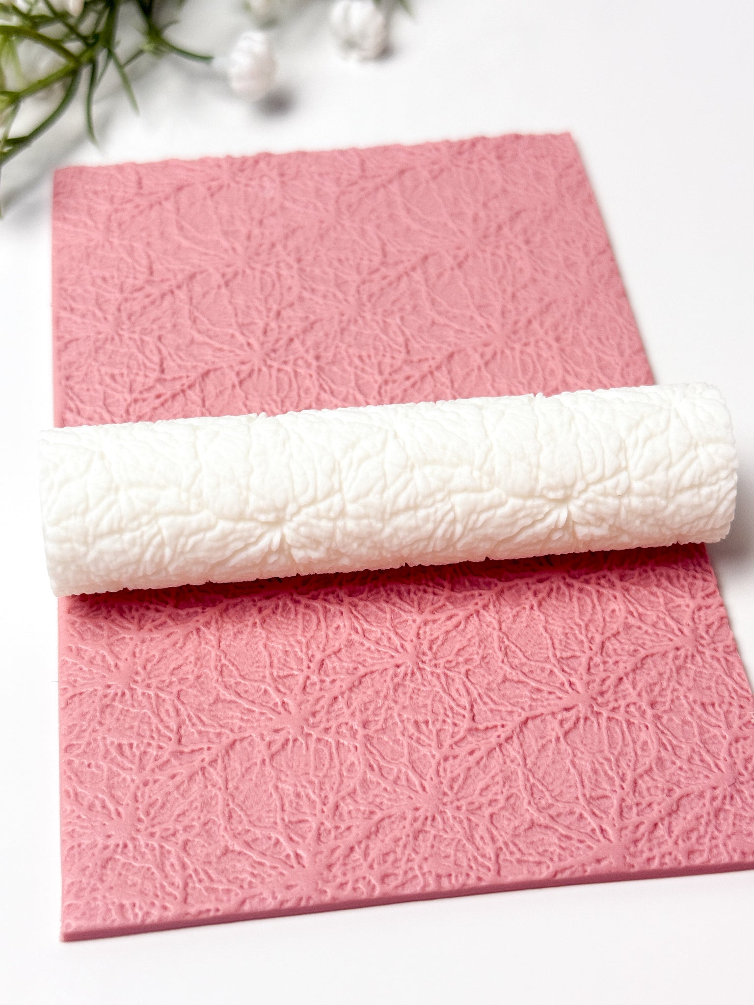 To avoid clay getting stuck inside the texture, you can use a bit of cornstarch or baby powder by lightly brushing it on the clay before using the roller. Achieving the same effect can be done by placing a piece of cling wrap on top of the clay.