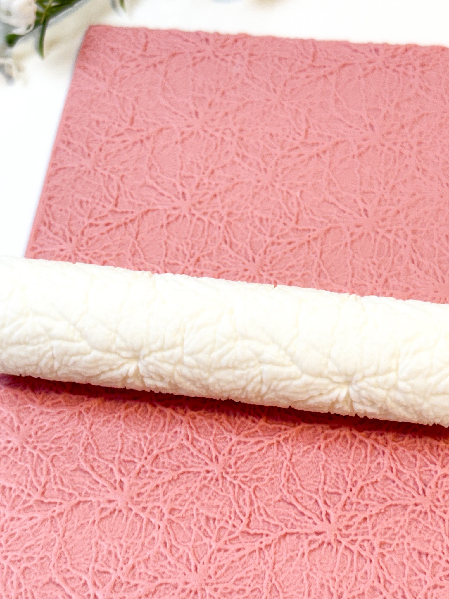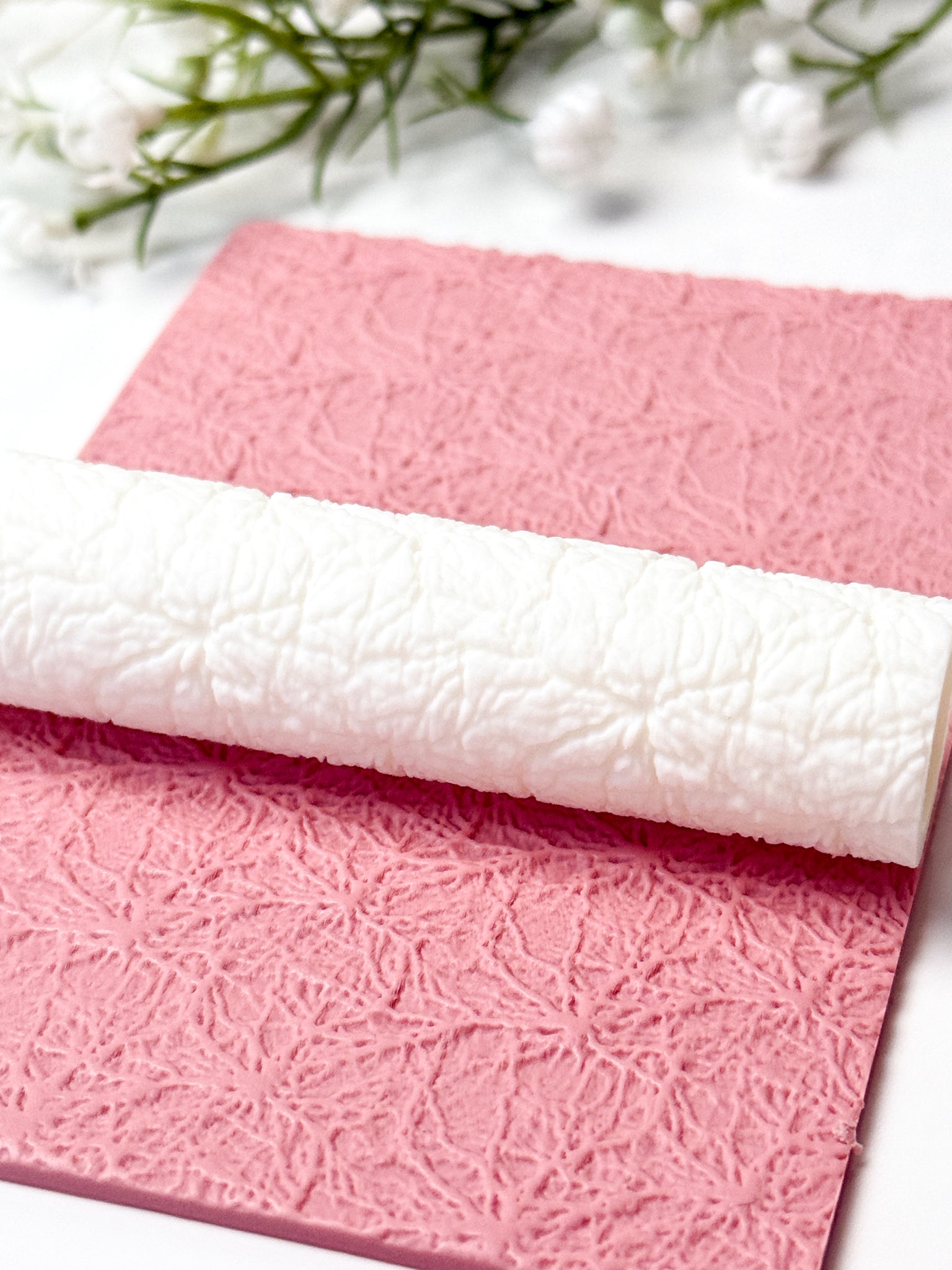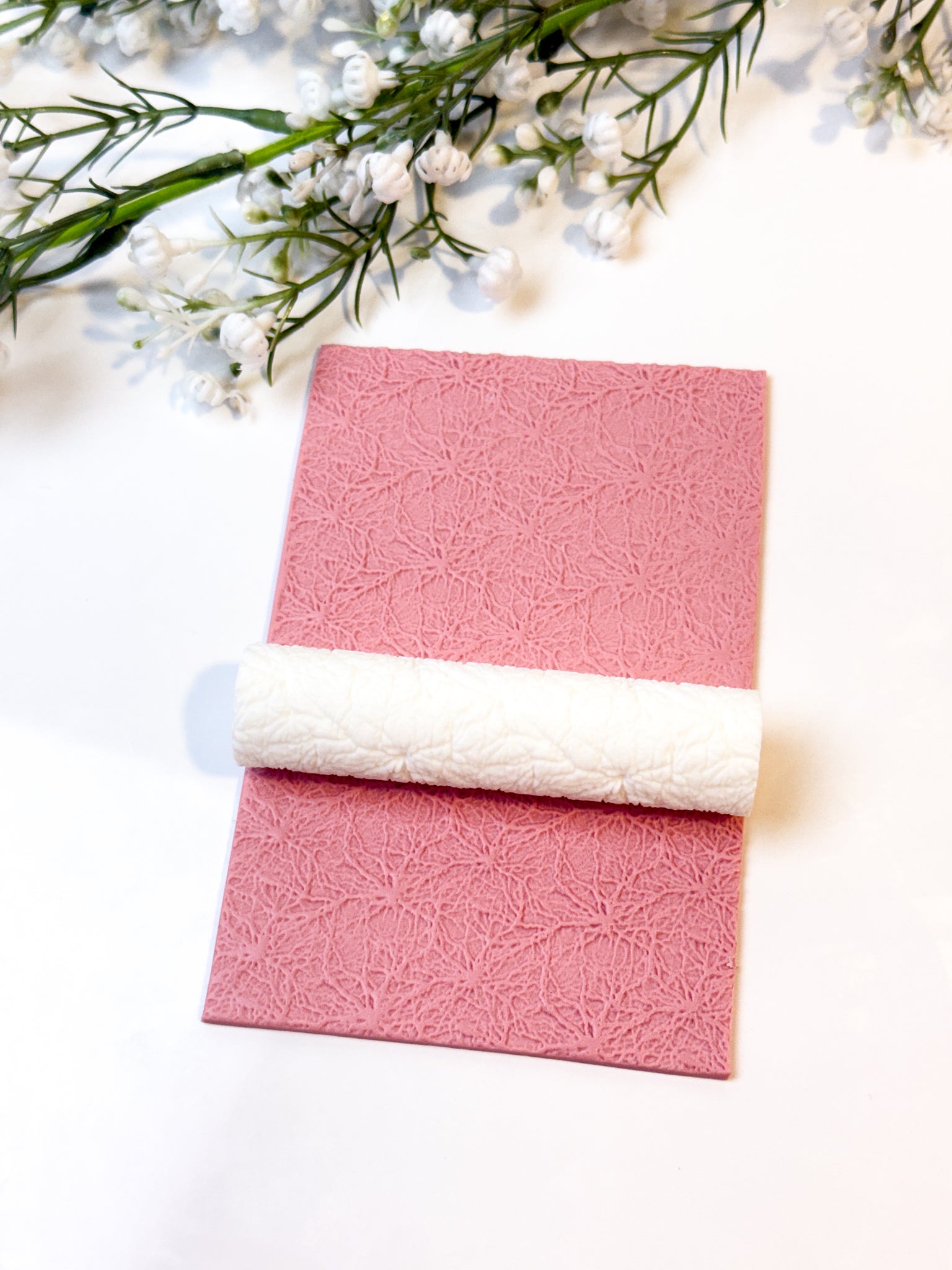 To avoid clay getting stuck inside the texture, you can use a bit of cornstarch or baby powder by lightly brushing it on the clay before using the roller. Achieving the same effect can be done by placing a piece of cling wrap on top of the clay.